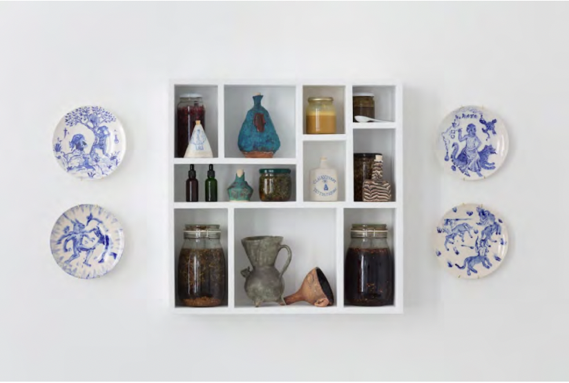 Wood cabinet with ceramics, glass jars, herbal tinctures, and glazed ceramic plates