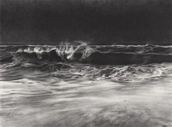 Her work ‘Weighing the Ocean (2018)’ on view in the exhibition exemplifies her charcoal drawing works which often excavate the power, force and tempestuousness of the sea.